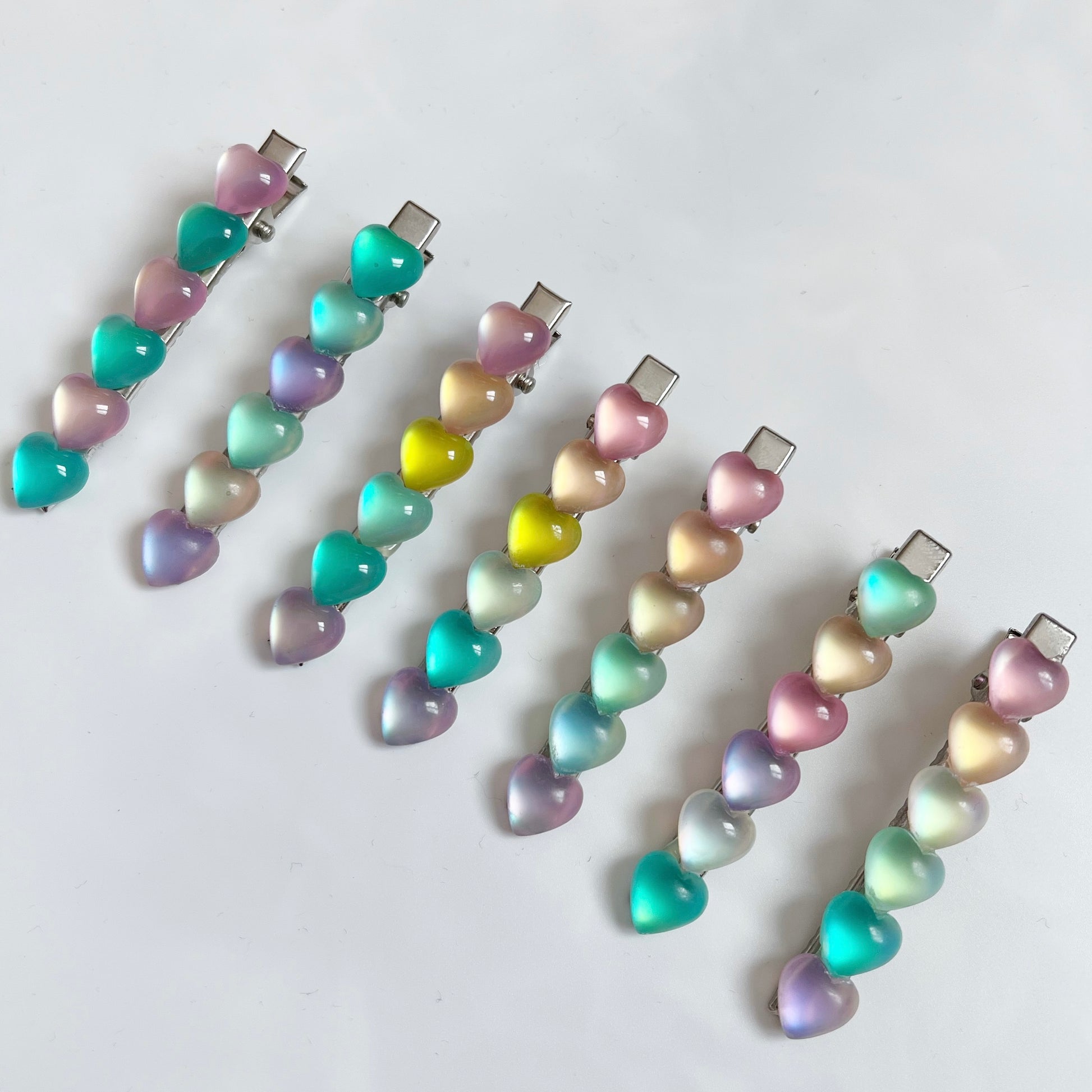 Mini opaque multicolored hearts on skinny alligator clip. Please note that due to the handmade nature of these clips, colors/patterns will vary.