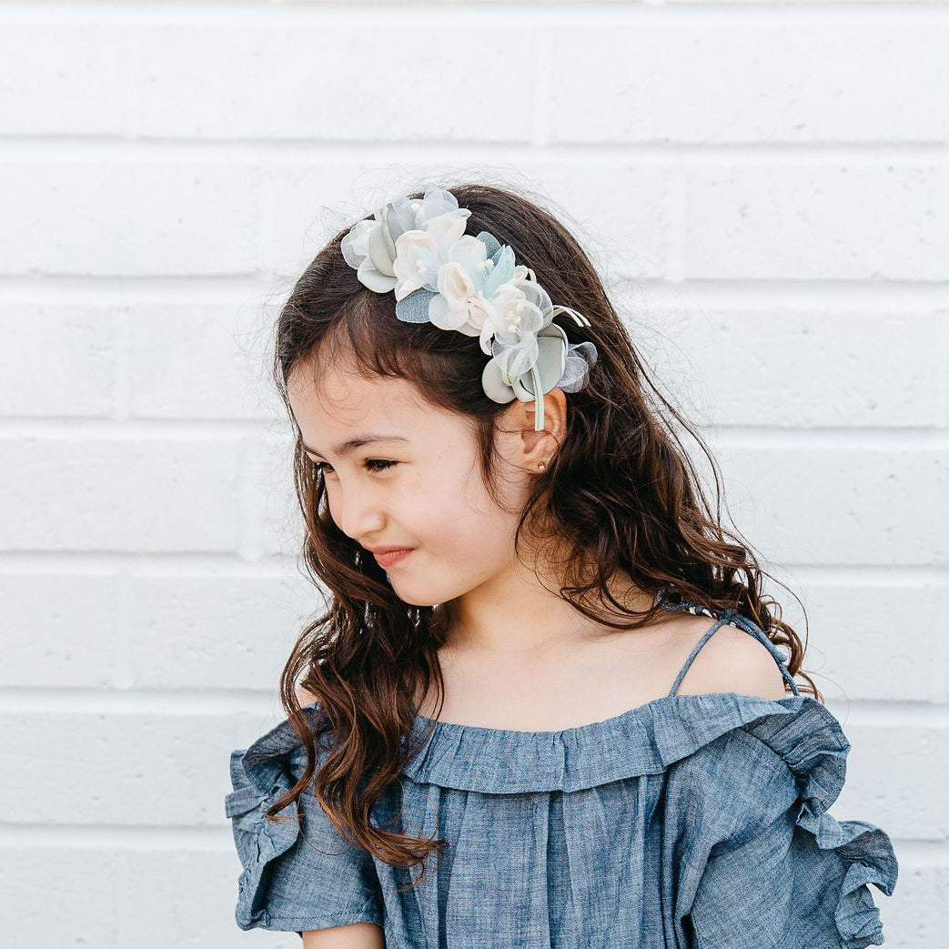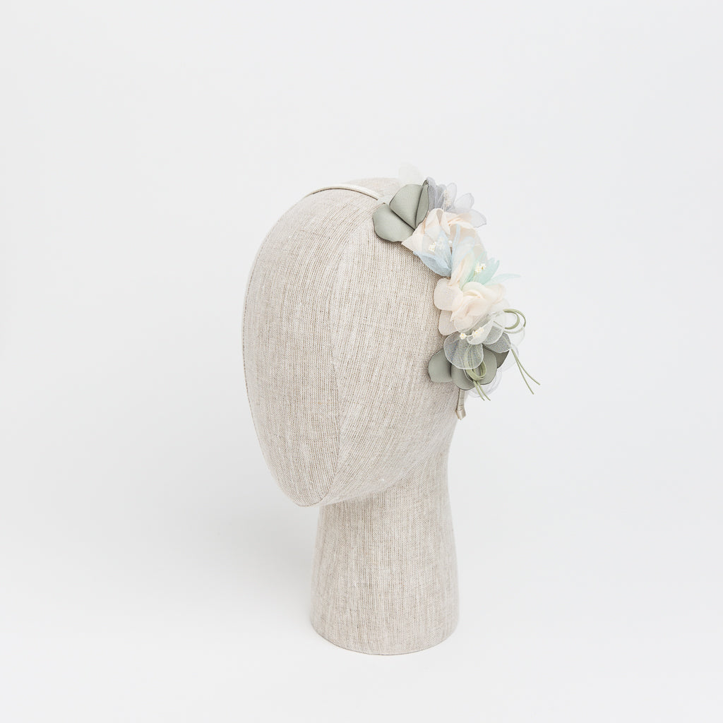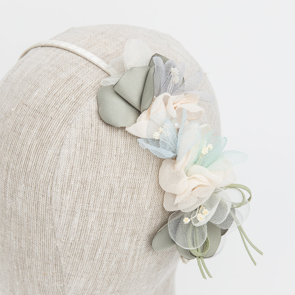 6 1/2" single row organza and faux silk flowers with floral details on wrapped headband