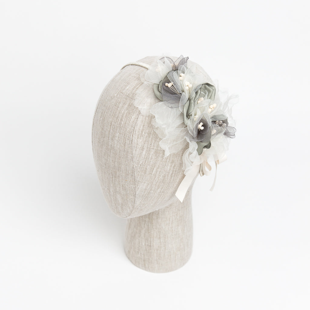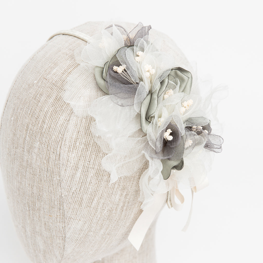 6 1/2" double row organza and faux silk flowers with floral details on wrapped headband